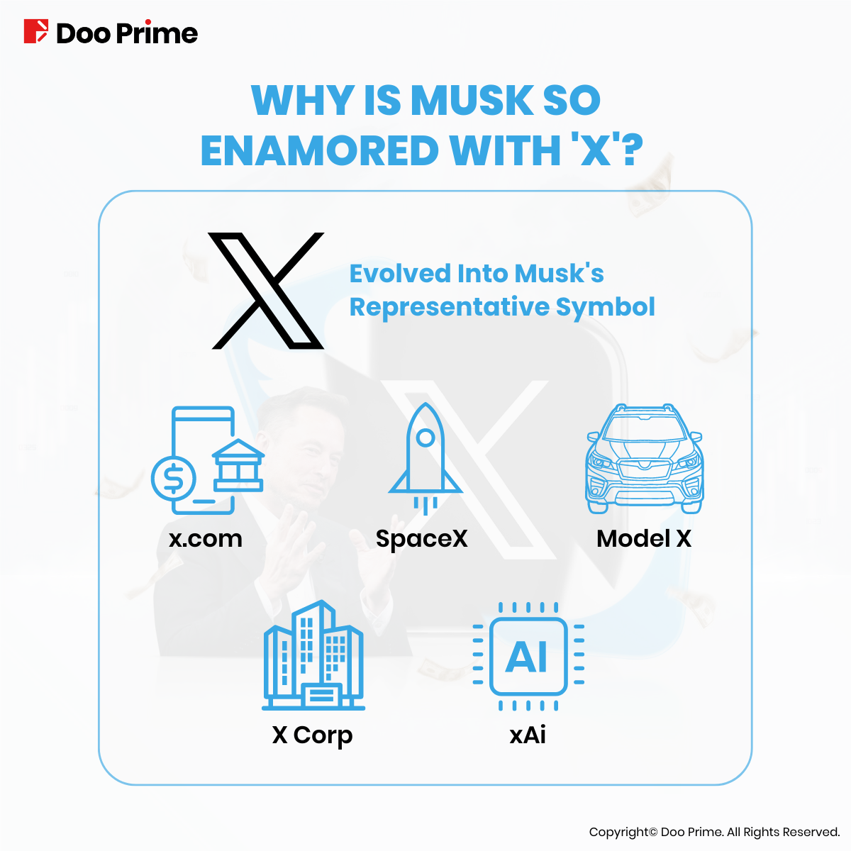 Furthermore, Musk’s space exploration company, established in 2002, bears the name “SpaceX.” In 2015, his electric vehicle and energy company Tesla introduced one of its flagship models called the “Model X.” Moreover, in 2023, Musk registered “X Corp” as the parent company of Twitter. Seizing the AI trend, Musk also founded an artificial intelligence company called “xAI.”