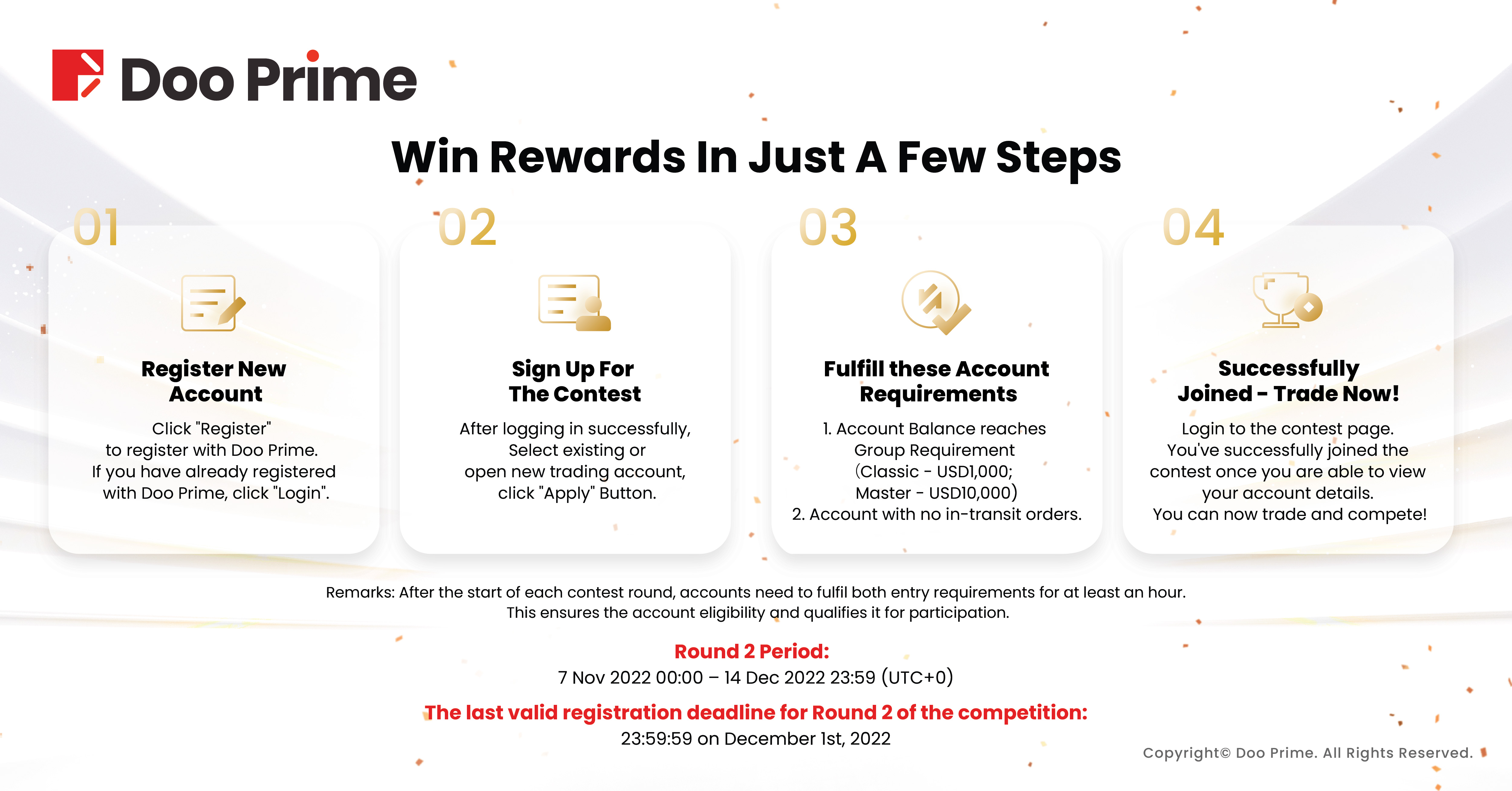Remarks: After the start of each round, if an account does not meet the minimum balance requirement for the category, or if there are open orders in the account, the system will not calculate the trading data. The data will not be counted until ONE HOUR after the account has met both of the abovementioned conditions.