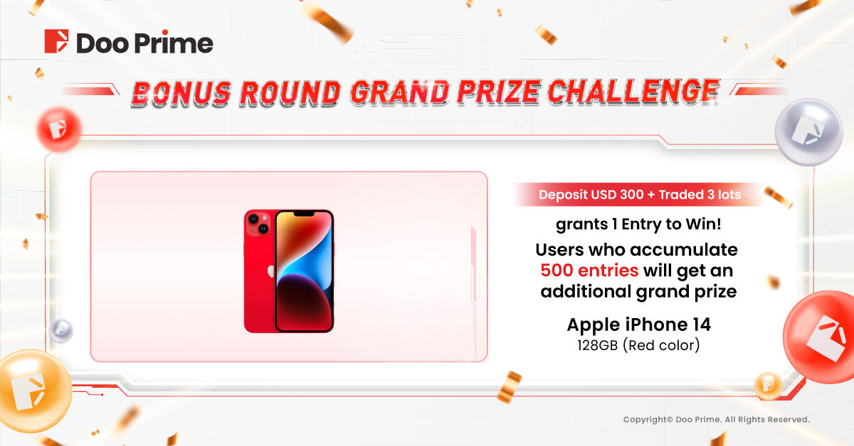In addition to one million cash and luxury gifts, Doo Prime has prepared an extra bonus challenge and Grand Prize for all investors. During the event, any client who accumulates 500 drawing entries will receive an additional ultimate Grand Prize – an Apple iPhone 14 128GB (Red color)!