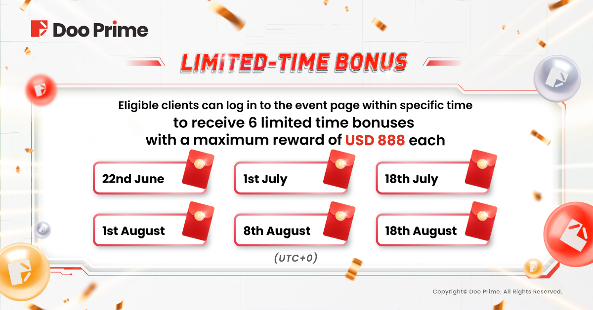Simply deposit USD 100 and trade 1 lot through the Doo Prime user center from now till August 31st, and you’ll be eligible to receive all 6 Limited-Time Bonuses with a maximum reward of USD 888 each!