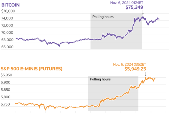 El resultado de las elecciones desató un aumento en las “operaciones Trump”, impulsando los rendimientos de los bonos del Tesoro de EE. UU., con la nota a 10 años alcanzando un máximo de cuatro meses en 4,479%. Bitcoin también alcanzó un récord por encima de 76.000 USD, mientras que el dólar registró su mayor ganancia diaria desde septiembre de 2022.