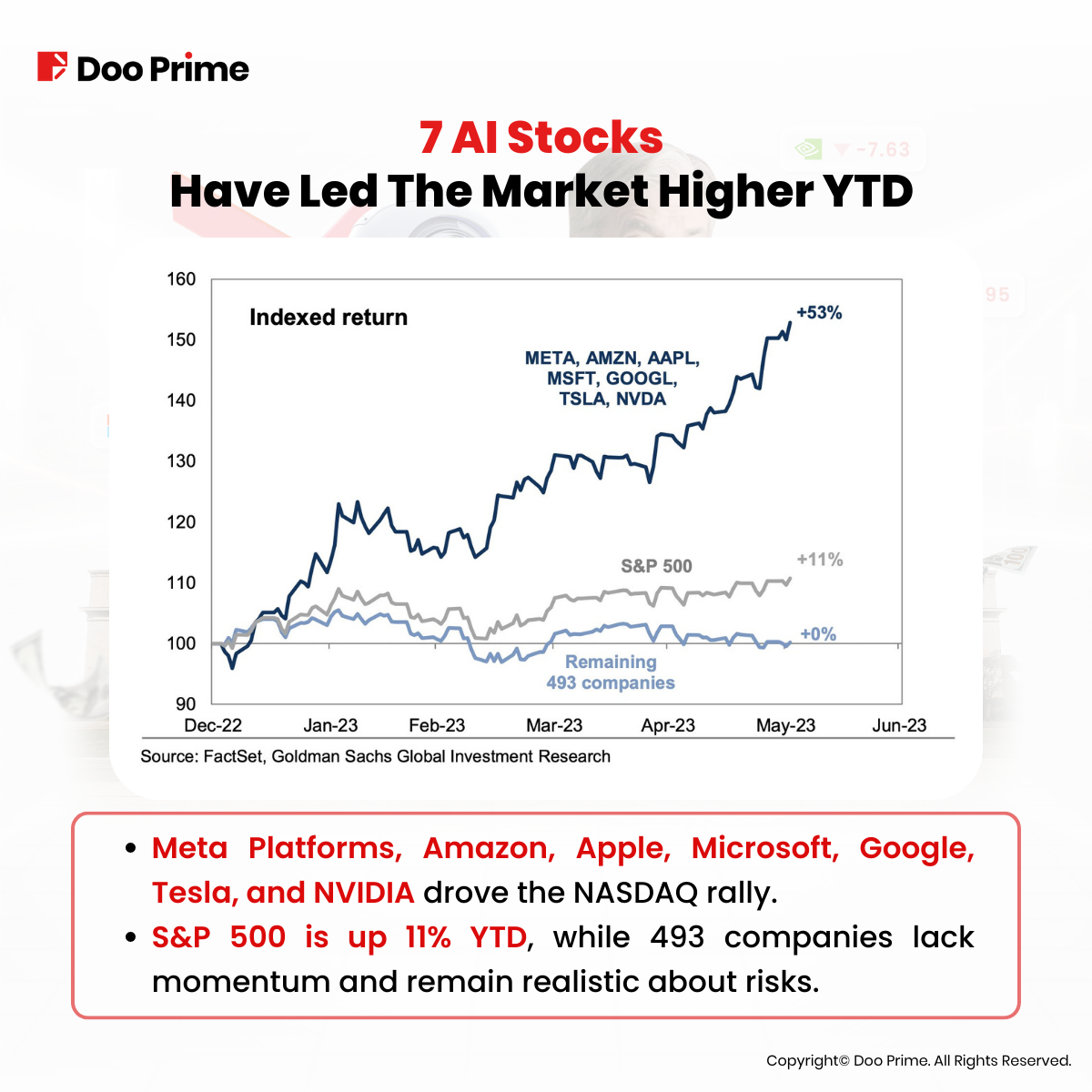 AI hype has taken over the market. Investors have become increasingly bullish on the future of this new technology, and they have forgotten about the rest of the market sectors. The seven AI stocks mentioned above have all seen historic gains in recent months. Meta Platforms, for example, has seen its stock price more than doubled since the beginning of the year. However, in this same period, most of the S&P 500 companies lacked any kind of momentum.