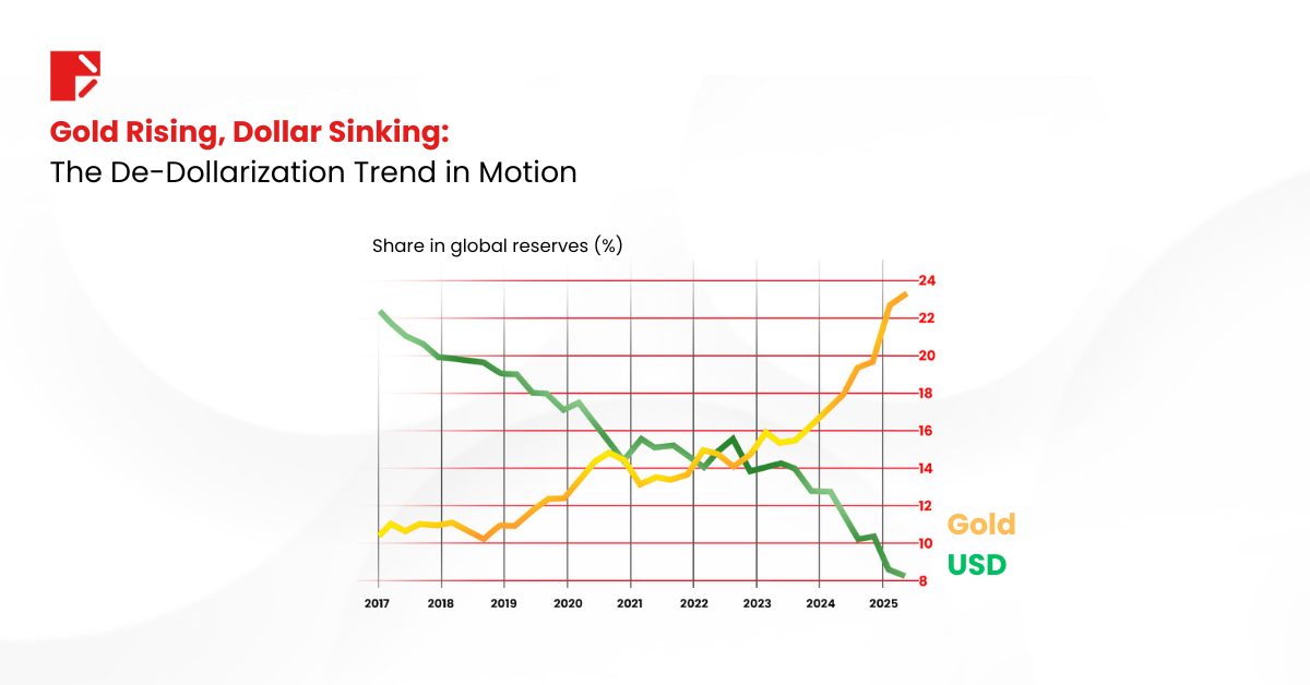 The chart above tells the bigger story: global reserves are shifting. Gold’s share is climbing fast while the dollar’s is in sharp decline. Central banks are diversifying, not just for yield but for safety from dollar-based volatility.