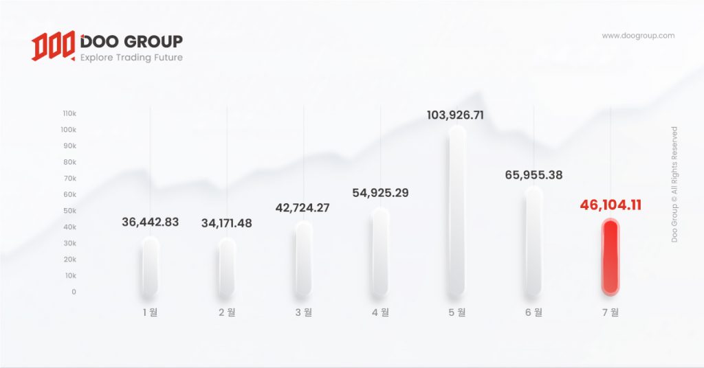 6월 미국 소비자물가지수 (CPI) 가 지난해 같은 달보다 9.1% 올라 41년만에 가장 높은 상승폭을 기록했습니다. 높은 인플레이션율을 억제하기 위해 지난달 27일 기준금리 75bp 인상을 발표했는데 이는 올 해 들어 네번째 인상입니다. 금리 인상의 영향으로 달러화가 크게 상승하면서 7월 주요 상품 가격이 하락한 가운데 에너지 가격이 1.3%, 금속 가격이 13.4%, 귀금속 가격이 6.6% 하락했습니다. 이에 따라 7월 상품 평균가격은 6월보다 다소 낮아졌고 7월 전체 거래량은 크게 올랐지만 가격 변동과 거시적 영향으로 전체 거래량은 하락했습니다. Doo Prime은 지금까지 3842.5억 달러로 지난해 같은 기간보다 134.35% 늘었습니다.
