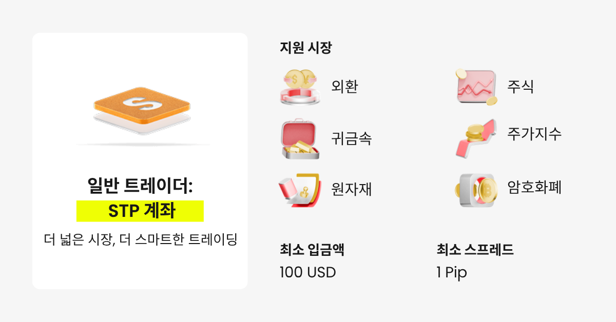 또한 STP 계좌는 Cent 계좌와 달리 다양한 거래 상품을 거래할 수 있어 포트폴리오 다변화를 원하는 트레이더에게 적합합니다.