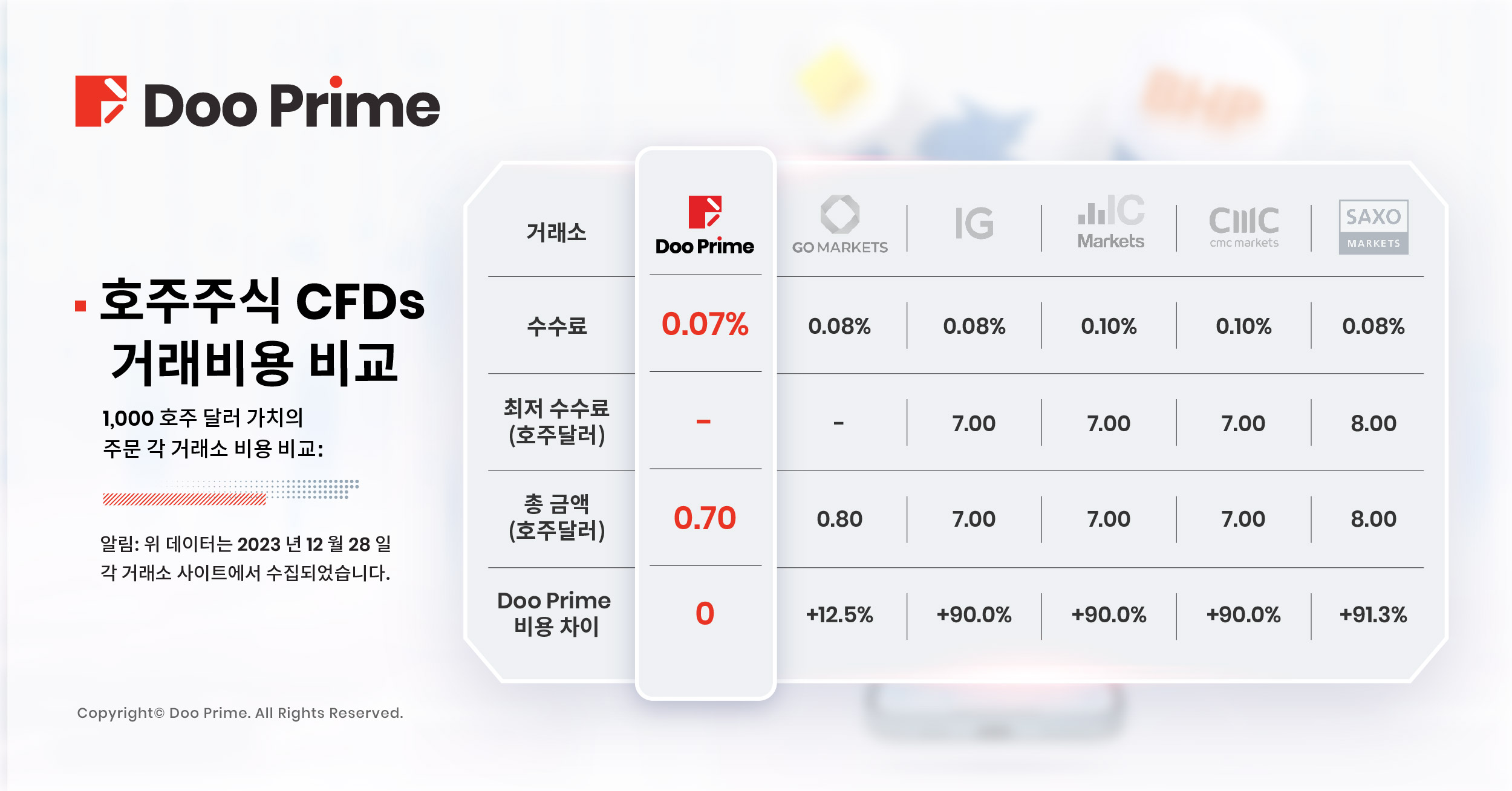 Doo Prime은 호주 주식 CFDs를 거래하는 고객에게 0.07%의 일방 수수료만 부과하고 최소 수수료를 설정하지 않아 투자자의 거래 비용을 크게 절감하고 소액 거래의 유연성을 향상시킵니다.
