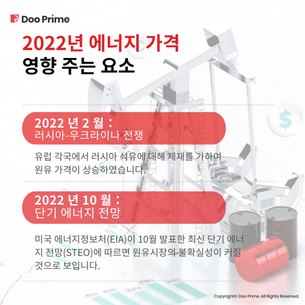 올 2월 초 시작된 러-우 전쟁 이후 지정학적·경제적 리스크가 급증한 데다 유럽과 미국이 러시아에 대한 석유 및 가스 수출에 대한 제재나 규제 조치를 취하면서 에너지 공급 중단에 대한 시장의 우려가 고조되면서 에너지 가격이 크게 올랐습니다.