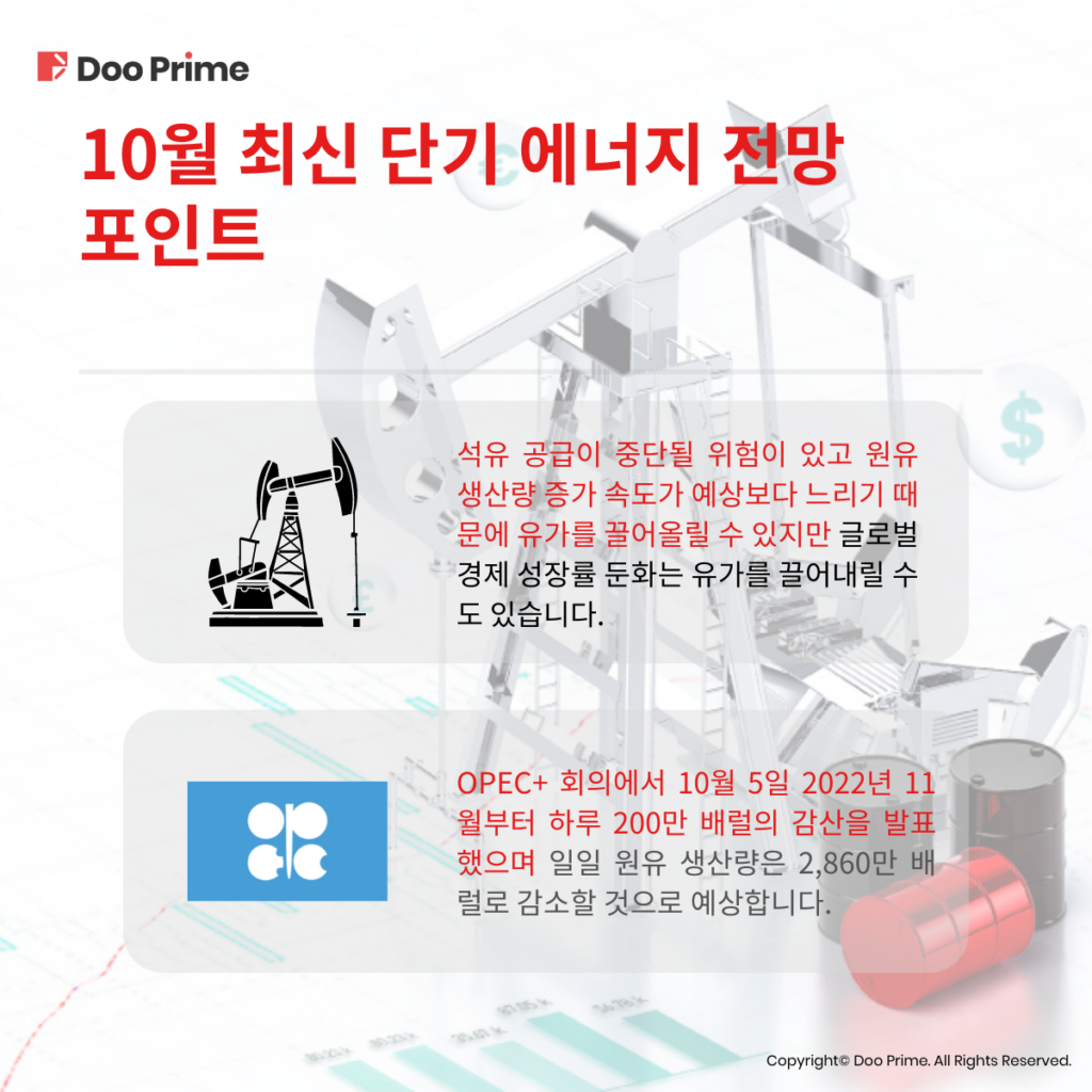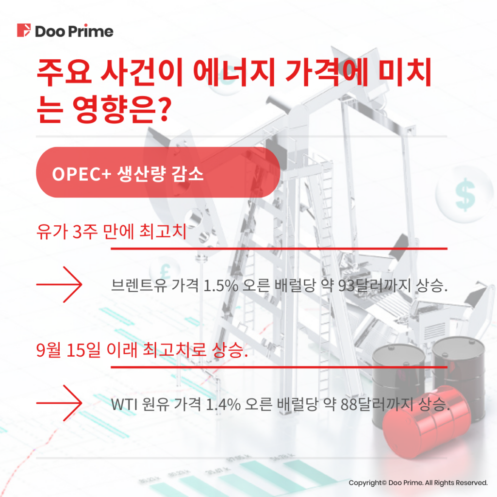 2022년 10월 OPEC은 유가를 지원하기 위해 생산량 감축을 시작했습니다. 감산 소식이 전해지자 브렌트와 WTI 원유 가격은 각각 배럴당 1.5%와 1.4% 올라 93달러, 88달러를 초과했습니다.