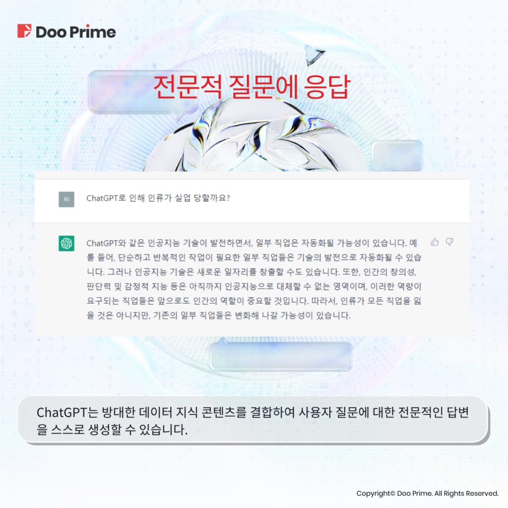 기존에 사용자가 인터넷에서 한 가지 질문에 대한 답을 얻으려면 검색엔진에서 키워드를 검색해 결과를 찾아야 했지만 ChatGPT는 방대한 양의 데이터를 결합한 지식 콘텐츠로 사용자 질문에 대한 전문적인 답변을 스스로 생성합니다. 이것은 마치 당신이 모든 분야의 지식이 풍부한 사람한테 질문을 하는 것과 같으며, 그는 자신의 지식을 최대한 활용하여 당신이 알고 싶은 질문에 대한 답을 당신에게 출력하는 것과 같습니다.