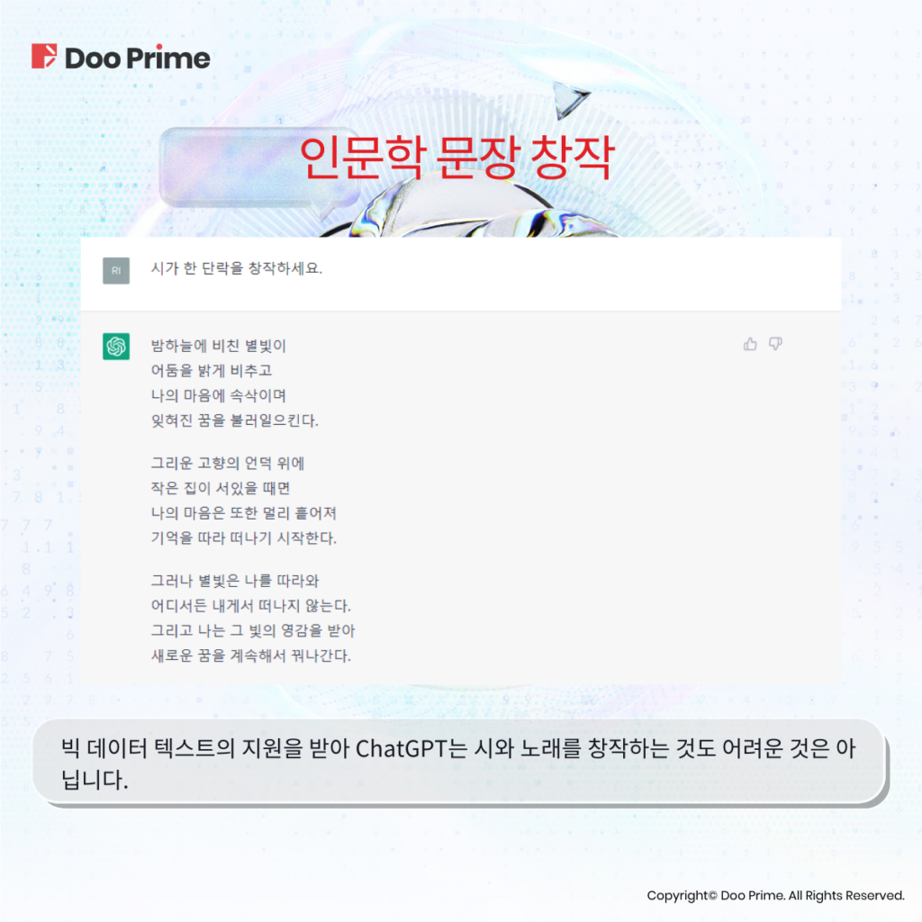 우리의 고정관념에서 인공지능은 이과적 논리분석에 대해서는 수월하지만 감수성이 필요한 인문학적 글쓰기에는 서툰 걸로 각인되여 있습니다. 그러나 이러한 고정관념이 반드시 ChatGPT에 적용되는 것은 아닙니다. 빅 데이터 텍스트의 지원을 받아 ChatGPT는 시와 노래를 창작하는 것도 어려운 것은 아닙니다.