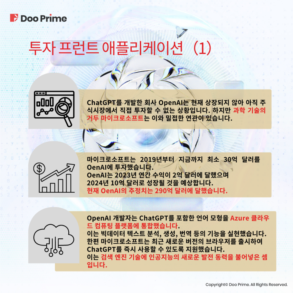 언뜻 보기에 ChatGPT는 새로운 과학 기술을 주도할 자세를 보이고 있습니다. 마이크로소프트 창업자인 빌 게이츠는 ChatGPT라는 인공지능 기술의 출현이 인터넷과 컴퓨터 탄생 못지않게 역사적 의미가 크다고 공개적으로 발표했습니다. 물론 본 글에서는 새로운 인공지능이 인류의 일자리를 대체할 수 있을지에 대한 논의보다는 투자의 관점에서 ChatGPT로 대표되는 인공지능 관련 분야에 투자할 가치 여부에 대해 중점을 두고 있습니다.