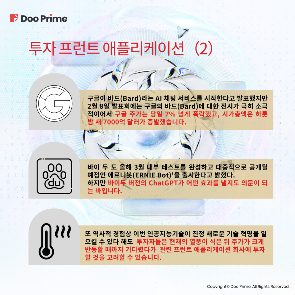 현재로선 ChatGPT는 확실히 놀랍지만 해당 프런트 애플리케이션 앱의 주가는 일부 성장되여 있습니다. 바이두의 경우 올해 들어 27% 이상 급등했습니다. 주식시장은 영원히 거래 예상 시장이며 바이두, 마이크로소프트와 같은 인공지능 프런트 회사의 현재 주가가 높게 상승하는 이유는 투자자들이 이미 ‘인공지능 기술이 미래에 이러한 회사들의 급속한 발전을 촉진할 것’이라는 기대를 거래하고 있기 때문입니다. 다시 말해, 만약 투자자들이 지금 이 주식에 투자하려고 한다면, 주가가 사실상 싸지 않기 때문에 투자자들에게는 주가 반등의 위험이 있을 수밖에 없습니다. 또 역사적 경험상 지난 10년간 수많은 부의 신화를 만들어낸 차세대 기술인 인터넷도 2000년 ‘인터넷 거품’이라는 큰 주가 하락 사건을 겪었습니다. 따라서 이번 인공지능기술이 진정 새로운 기술 혁명을 일으킬 수 있다 해도 투자자들은 현재의 열풍이 식은 뒤 주가가 크게 반등할 때까지 기다렸다가 관련 프런트 애플리케이션 회사에 투자할 것을 고려할 수 있습니다.