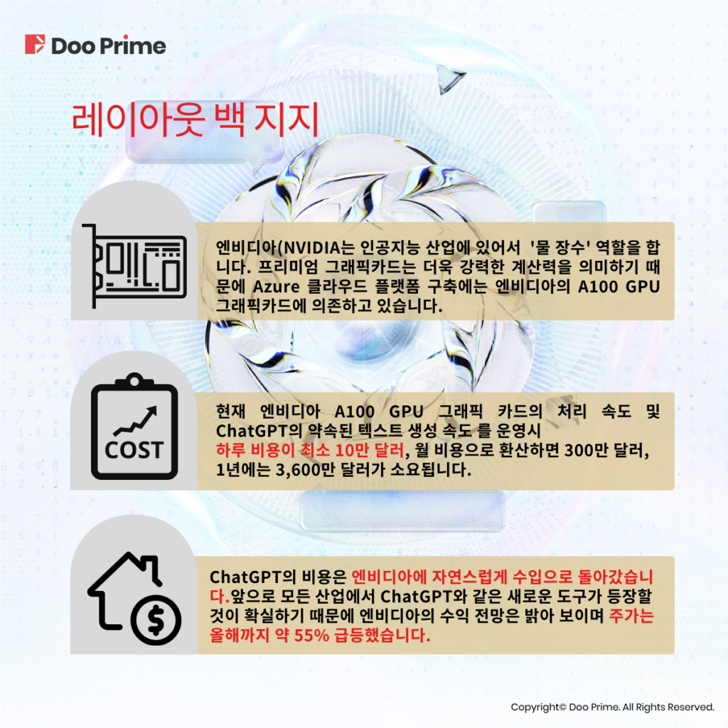 엔비디아가 오랜 기간 동안 프리미엄 게임 그래픽카드로서 깊게 각인되었지만 프리미엄 그래픽카드는 더욱 강력한 계산력을 의미하기 때문에 엔비디아가 인공지능 업계에서 독보적인 우위를 점할 수 있었던 이유입니다. OenAI 자체는 서버룸을 구축하지 않고 ChatGPT를 포함한 모든 업무를 마이크로소프트의 Azure 클라우드 플랫폼에서 실행하고 있으며, Azure 클라우드 플랫폼 구축에는 엔비디아의 A100 GPU 그래픽카드에 의존하고 있다고 앞서 언급했습니다.