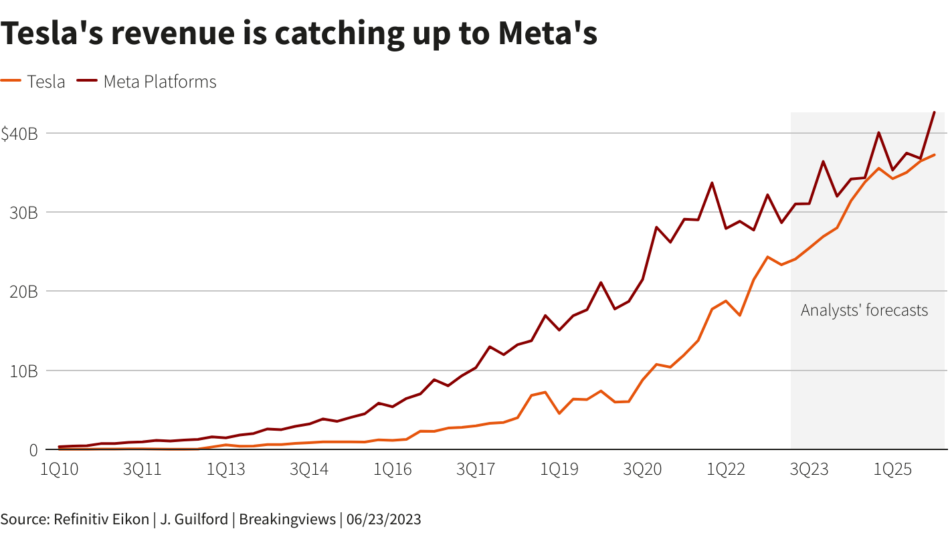 Although Meta may be larger in terms of revenue, but Tesla is showing rapid growth as of late, due to the surge of market demand for electronic vehicles (E.V.). Analysts polled by Refinitiv expect the two companies’ top lines to almost converge by 2025. And in investment terms, Musk takes the point over Zuckerberg here.