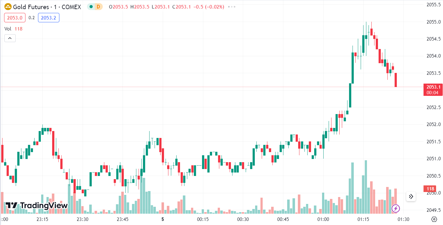 On Thursday, following the release of optimistic employment data in the United States, the spot gold price slightly declined from above USD 2050 per ounce to around USD 2036 per ounce, ultimately rebounding to the USD 2040 range and closing at USD 2043.42 per ounce, a gain of 0.09%.