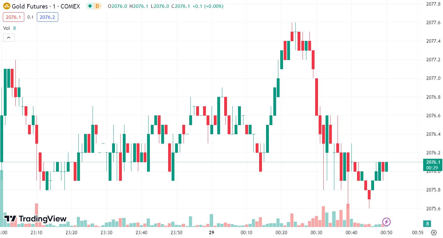 On Thursday, gold prices rose to USD 2088 per ounce in early trading but lost appeal and fell below USD 2070 per ounce. U.S. bond yields moderately rebounded, with spot gold closing at USD 2065.37 per ounce, down 0.59%. Gold futures also declined by 0.46%, closing at USD 2083.5 per ounce.