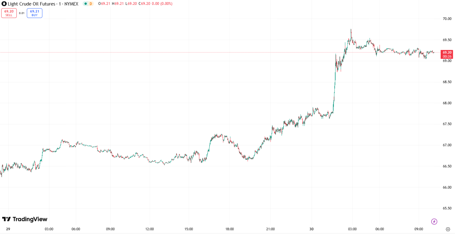 布伦特原油期货上涨 0.19%,报每桶 72.65 美元;美国 WTI 原油期货上涨 0.03%,至 69.23 美元。