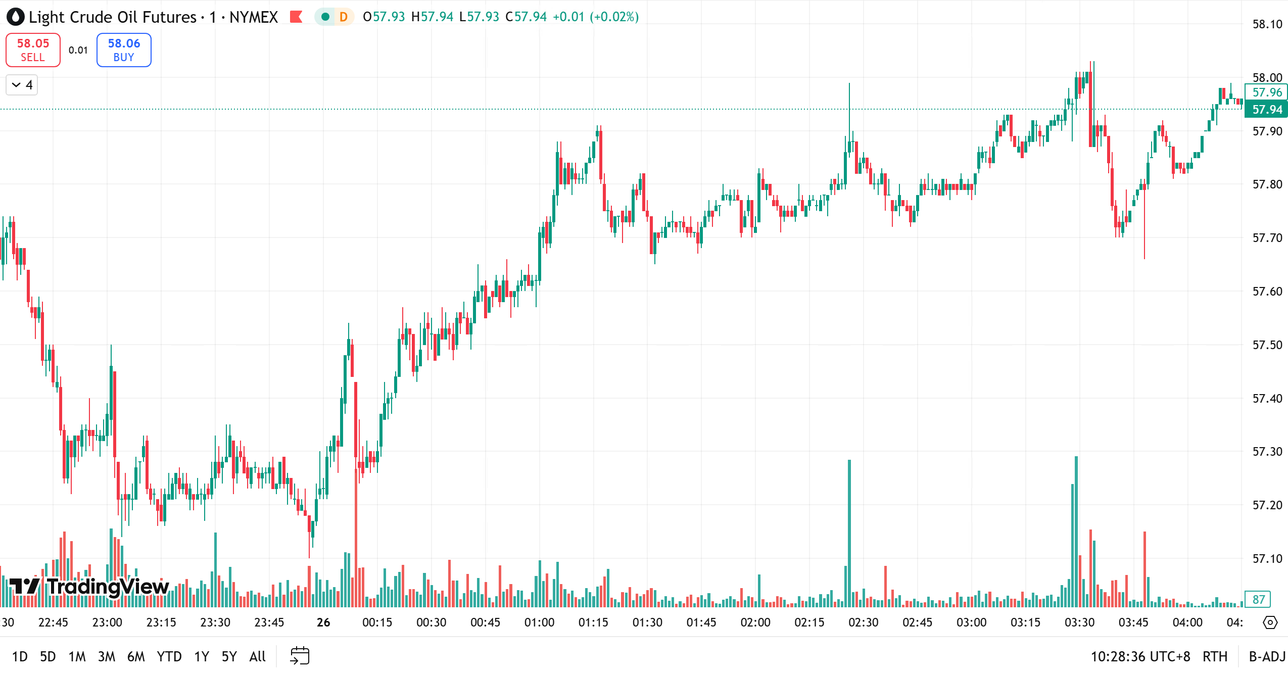 周三,周二现货黄金交投于 4133.6 美元/盎司附近,金价周二持稳,盘中曾触及 11 月 14 日以来最高水平。市场对美联储将在 12 月降息的预期持续升温,目前概率已升至 85%;美原油交投于 58.08 美元/桶附近,油价周二延续跌势,主要因乌克兰暗示可能接受美国提出的和平协议框架,引发市场对俄乌战争结束及后续俄罗斯石油供应重返市场的担忧。