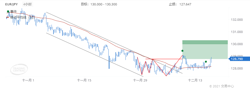 2021年 12月 08日(GMT时间17:00)我们在4小时图表上发现称为三重底的形态,确定了长达2周在130.000到130.300范围内的目标价。