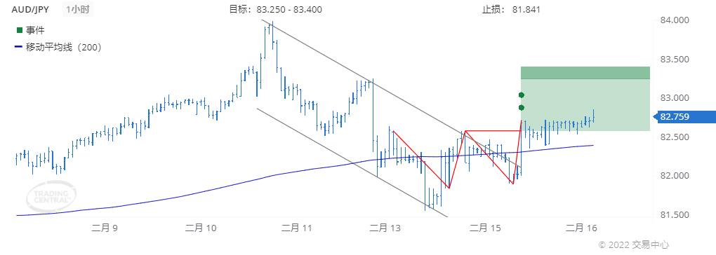 2022年 2月 15日(GMT时间09:00)我们在1小时图表上发现称为双重底的形态,确定了长达2周在83.250到83.400范围内的目标价。