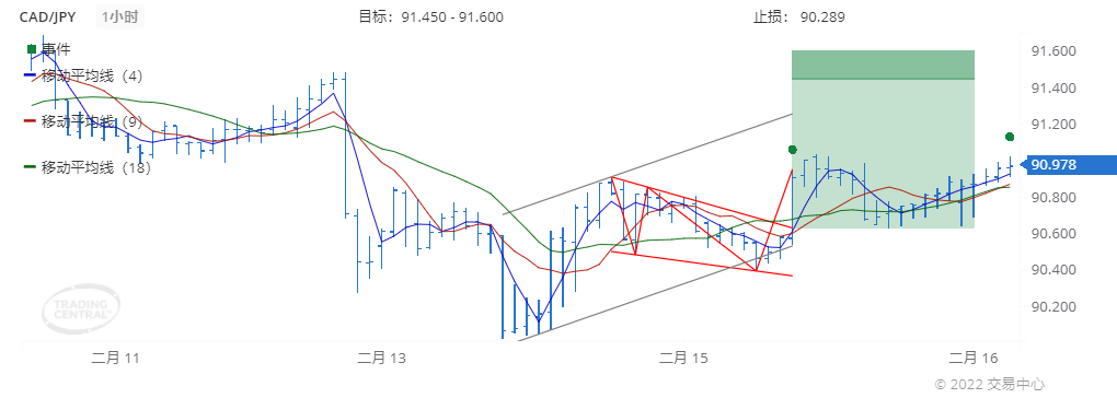 2022年 2月 15日(GMT时间09:00)我们在1小时图表上发现称为旗形(看涨)的形态,确定了长达48小时在91.450到91.600范围内的目标价。