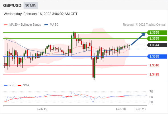 在 1.3525 之上,看涨,目标价位为 1.3555 ,然后为 1.3565 。