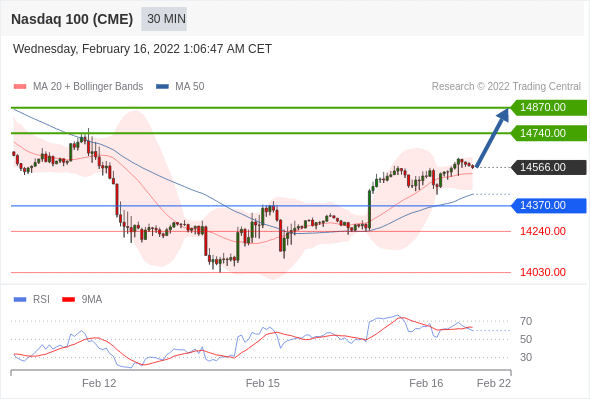 在 14370.00 之上,看涨,目标价位为 14740.00 ,然后为 14870.00 。