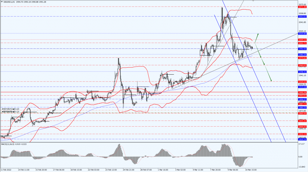 目前交投于 1991 美元附近,此前乌克兰与俄罗斯外长的会谈未能就停战问题取得进展,逢低买盘继续给金价提供支撑,而且美国 2 月通胀率创 40 年新高,吸引投资者买入黄金对冲通胀。