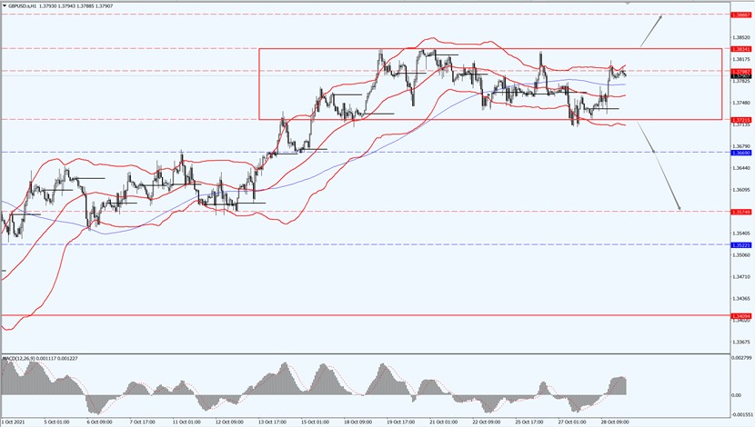英镑今日主要关注 1.3721 到 1.3834 区间的突破方向,如果向上突破 1.3834 一线,则将打开进一步的上行空间,届时关注 1.3888 一线。