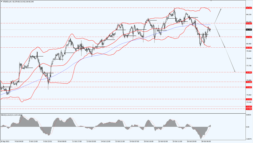 油价今日关注 83.04 一线,如果油价运行于 83.04 一线下方,则依旧保持顺势看空的思路,届时依次关注 80 和 76.89 两个位置的支撑力度。