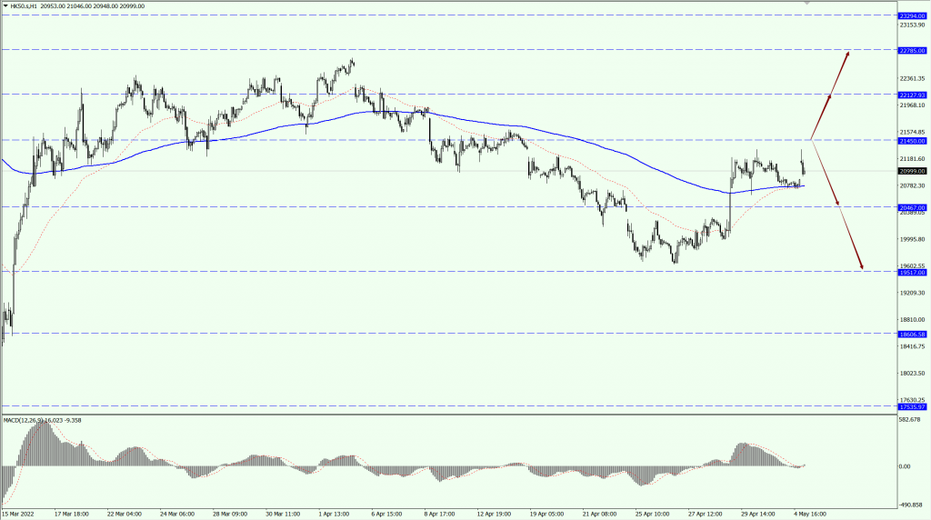 - 如果 HK50 运行于 21450 一线上方,届时关注 22127 和 22785 两个位置的压制力度。