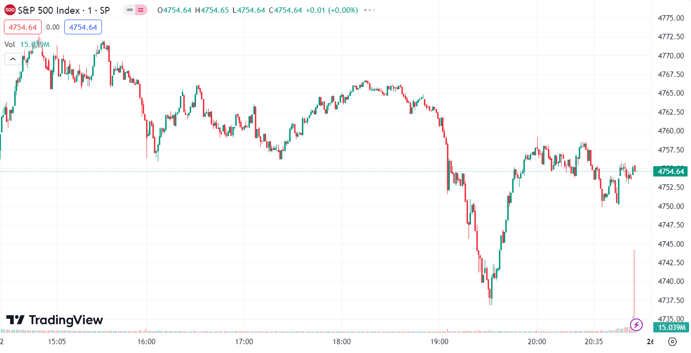 - 标普 500 指数涨 7.88 点,涨幅为 0.17%,报 4,754.63 点