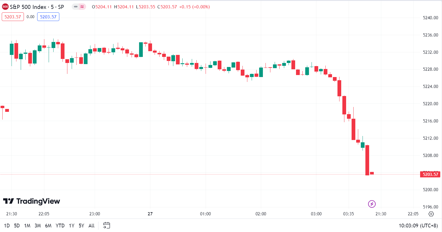 - 标普 500 指数跌 14.61 点, 跌幅为 0.28%,报 5,203.58 点