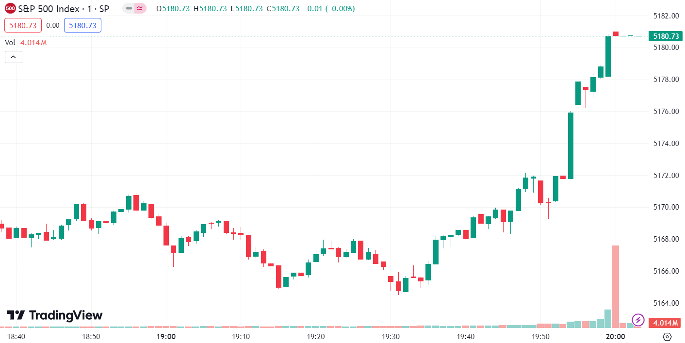 - 标普 500 指数涨 52.95 点,涨幅为 1.03%,报 5,180.74 点