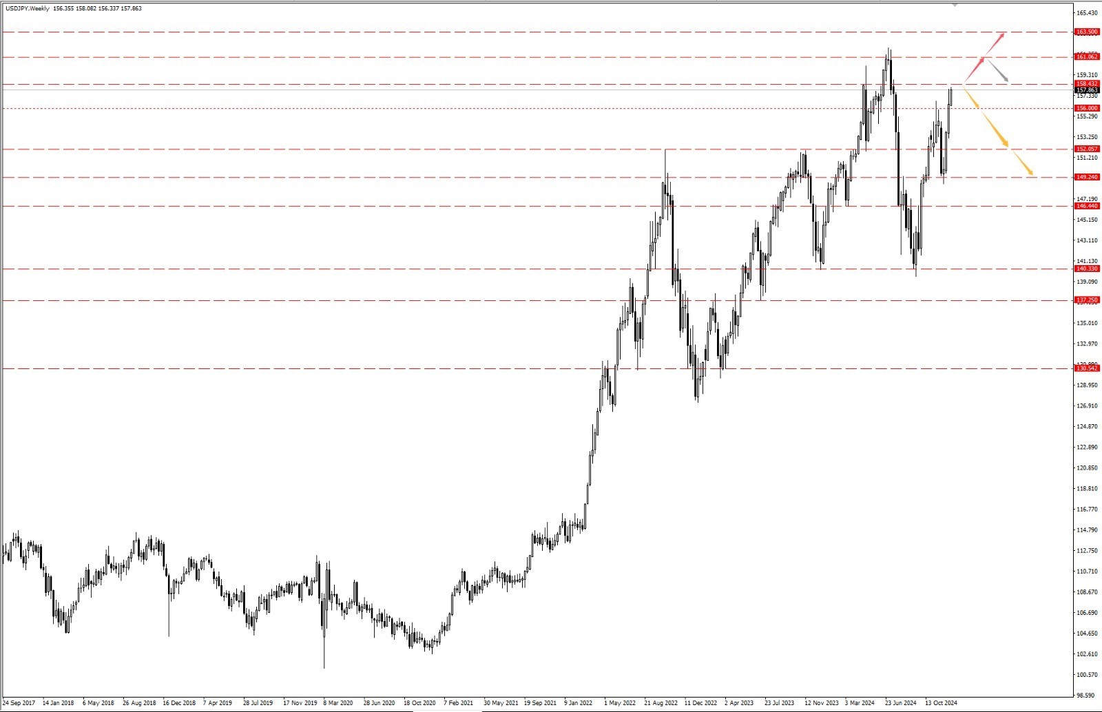 - 如果美元兑日元在 158.43 一线附近承压下行,则依次关注 156、152.05 和 149.24 三个位置的支撑力度;