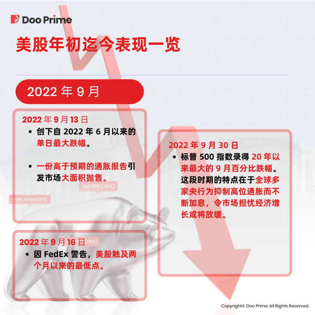 | 道琼斯指数 | –6,161.25 | –16.84% | 2022年 9 月 30 日跌至 28,725.51 |