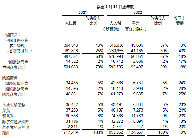把业绩拆开看,中国商业分部下的几个细分业务有的增长承压,但有的增长势头较好。