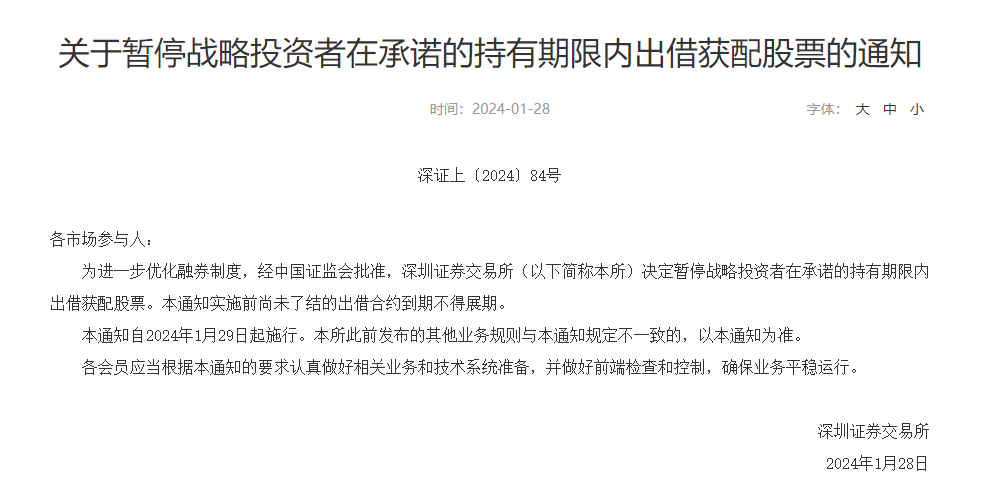 与此同时,沪深交易所也发布通知称,决定暂停战略投资者在承诺的持有期限内出借获配股票,本通知实施前尚未了结的出借合约到期不得展期,自 2024 年 1 月 29 日起施行。