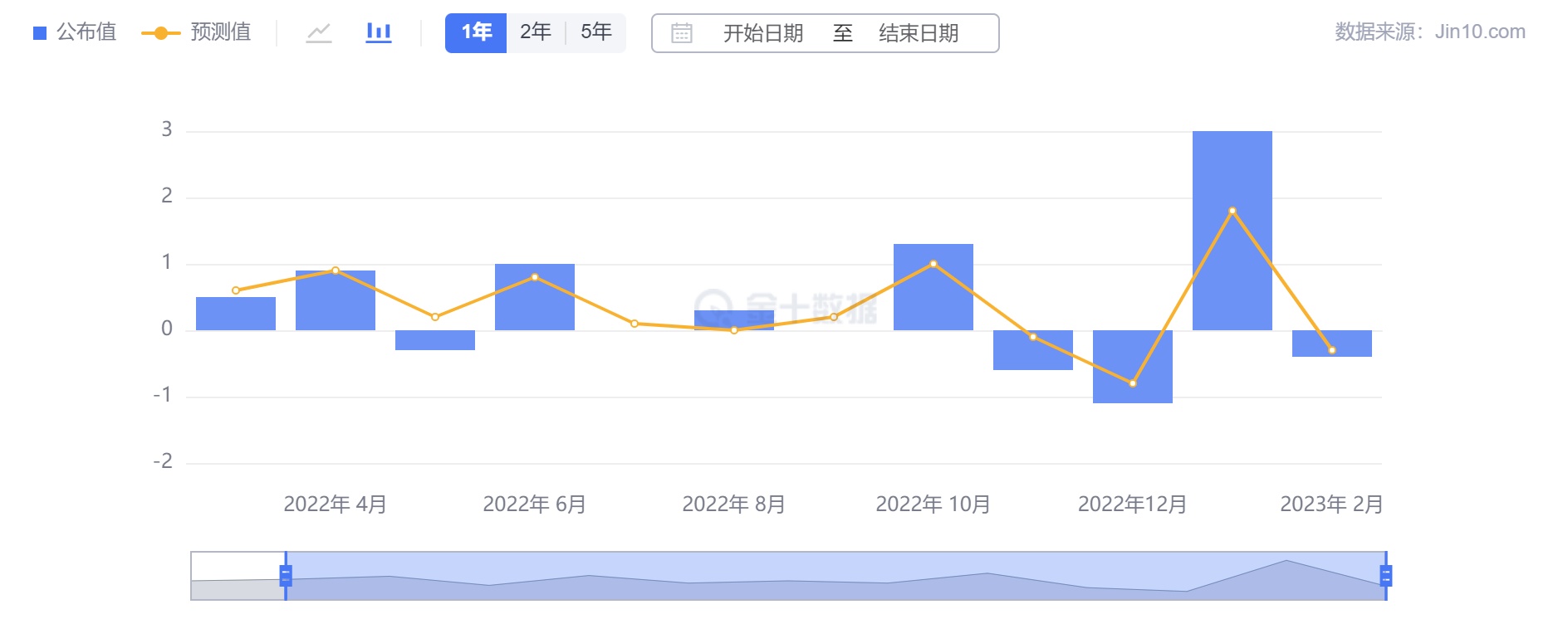 3 月 15 日,美国劳工部发布的数据显示,2 月生产者价格指数( PPI )环比下降 0.1%,低于预期的 0.3%,前值为 0.7%;同比增长 4.6%,也较上月的 6% 有所放缓,是 2021 年 3 月以来的最低增速。剔除食品、能源和贸易的核心 PPI 在 2 月环比增长 0.2%,低于预期的 0.4%,前值为 0.5%;核心 PPI 同比增长由 1 月份的 5% 放缓至 4.4%,同时也低过预期的 5.2% 升幅。