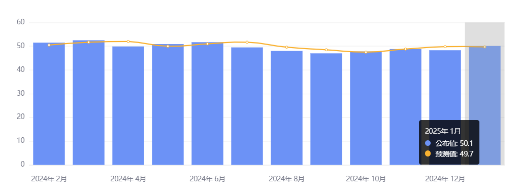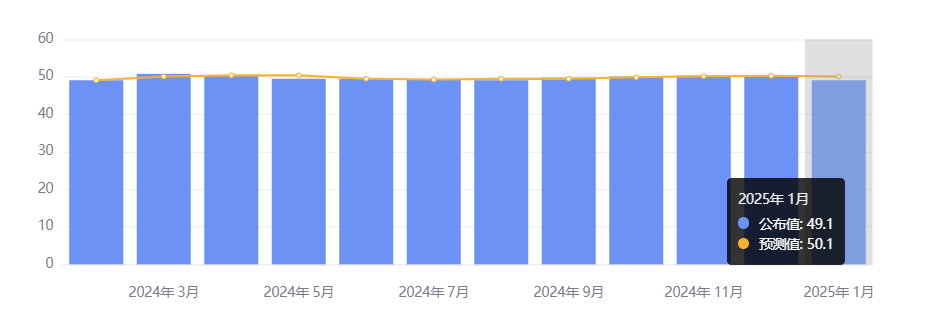 1 月 27 日,中国国家统计局公布数据显示,1 月官方制造业 PMI 为 49.1,前值为 50.1;非制造业 PMI 为 50.2,前值为 52.2,高于临界线,整体保持扩张;综合 PMI 为 50.1,前值为 52.2。