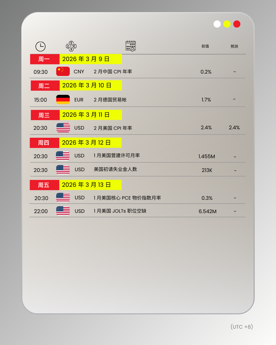 财经日历 | 以下为 2026 年 3 月 9 日至 2026 年 3 月 13 日(GMT+8 北京时间) 全球重大经济事件提醒。在重大行情期间,请确保您已审查您的保证金率,并有足够的保证金来支撑您的风险敞口。