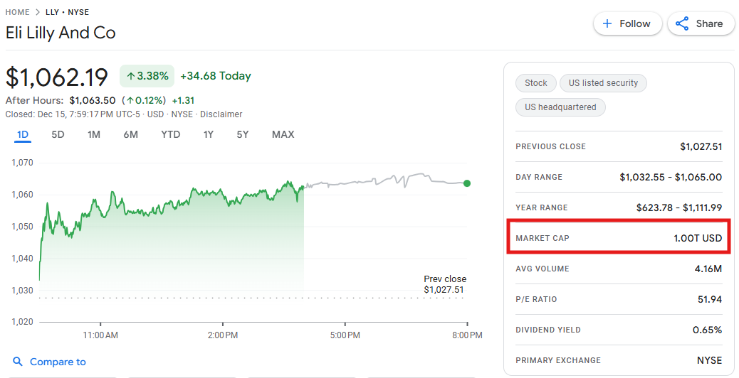 行业动态 | 礼来市值一度突破 1 万亿美元,创全球首家“兆元药厂”纪录