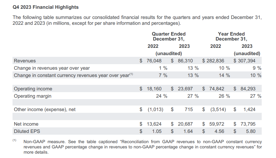 谷歌母公司 Alphabet 在美股盘后公布了其 2023 年第四季度财报。Alphabet 四季度收入为 863.1 亿美元,高于分析师预期的 853.3 亿美元;每股收益达到 1.64 美元,高于预期的 1.59 美元。其中,第四季度的广告收入为 655 亿美元,高于去年同期的 590 亿美元,但低于分析师预期的 661 亿美元。
