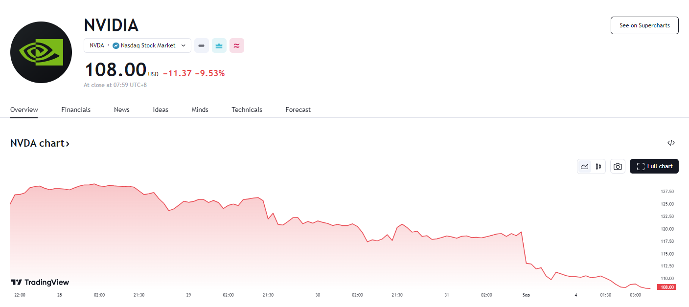 英伟达跳空低开 2.8%,此后一路走低,收跌 9.5%,股价下逼 108 美元至 8 月 9 日以来的三周最低,市值缩水 2790 亿美元,进一步远离 3 万亿关口,并创下美股有史以来最大规模的单日市值损失。