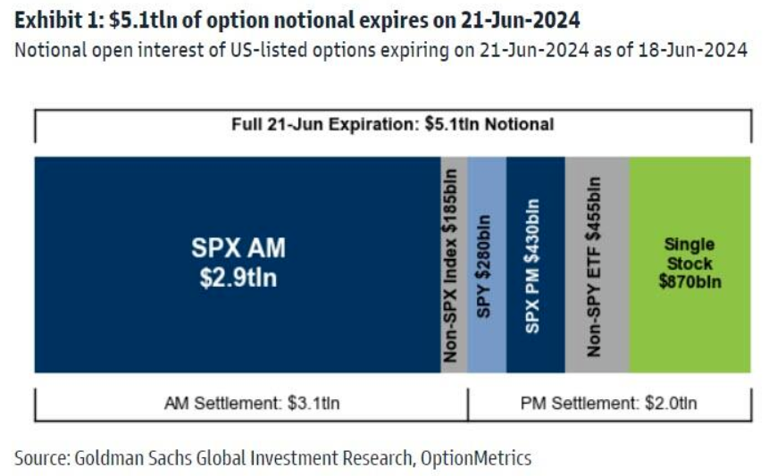 据高盛分析师 John Marshall 估计,本周五,三巫日美股的期权到期规模将是有史以来最大的一次,到期期权的名义价值将超过 5.1 万亿美元。