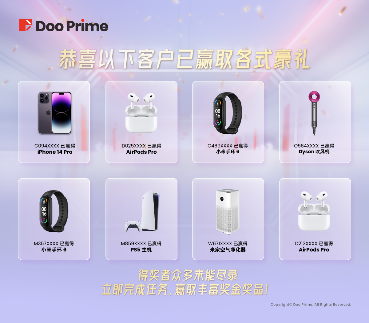 截至目前为止,Doo Prime 已派出 500+ 份实体礼品,连同其他奖金,已合共送出超过 USD 100,000+ ,短短两周已有超过 5,000 人参与了抽奖,全球幸运大抽奖中的每款礼品都承载了 Doo Prime 最诚挚的谢意,以感谢全球客户始终如一的支持和信任。首批中奖客户的幸运礼品已经在派发途中,敬请期待。