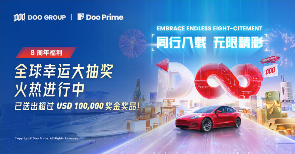 “同行八载,无限精彩” Doo Group 8 周年回馈活动自开展以来,获得全球客户的踊跃支持和参与,我们精心准备的多重福利亦深受客户喜爱。Doo Prime 更在 11 月 21 日起豪掷超两千万元举办全球客户回馈大抽奖活动,力求以丰富的奖金及奖品答谢全球客户。