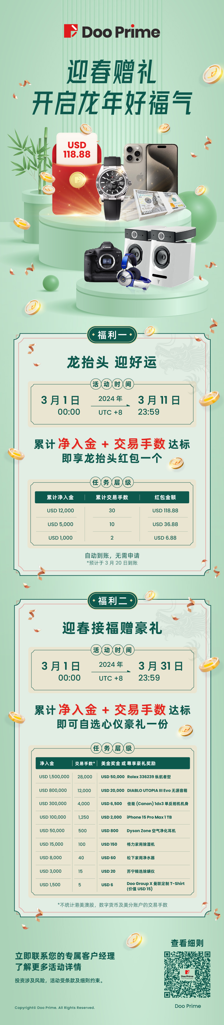 此外,Doo Prime 更准备了春日专属龙抬头红包!客户只需在 2024 年 3 月 1 日至 3 月 11 日期间,完成指定的净入金额及交易手数,即可自动获得龙抬头红包。红包将自动到账,无需申请!参与活动,与 Doo Prime 一起迎接春天的到来,抓住每一个美好时刻,开启交易新篇章!