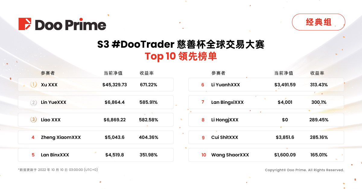 S3 #DooTrader 慈善杯全球交易大赛奖池累计超过 1,000,000 元,分为两轮赛制,每轮赛事两组各颁发 10 个奖项, 获奖机会更多,奖金更多!参赛者每交易一手,Doo Prime 将捐赠 10 倍常规善款—即 0.1 美金,支持全球贫困儿童的教育工作。
