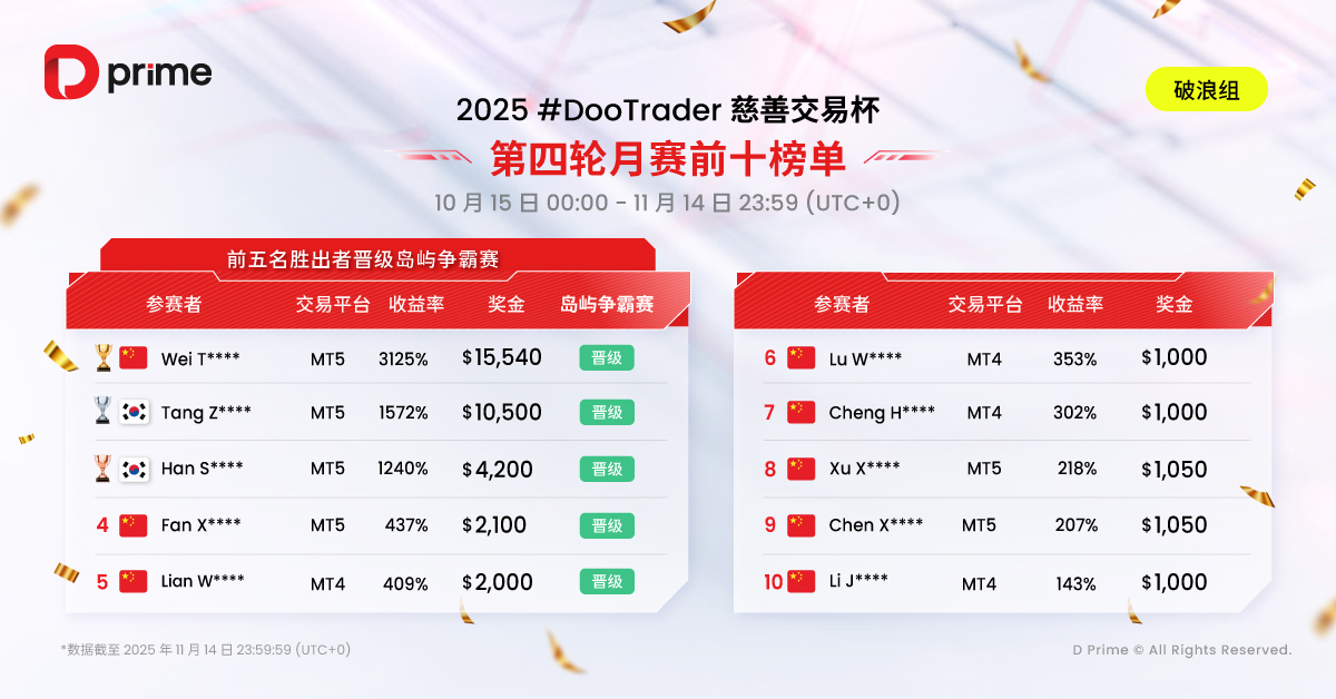 2025 年 D Prime #DooTrader 慈善交易杯第四轮月赛已于 11 月 14 日 23:59(UTC+0)顺利收官,赛果榜单火热揭晓!第五轮月赛紧随于 2025 年 11 月 15 日 00:00(UTC+0)开赛 —— 欢迎各路交易高手立刻报名,争夺线下决赛名额!